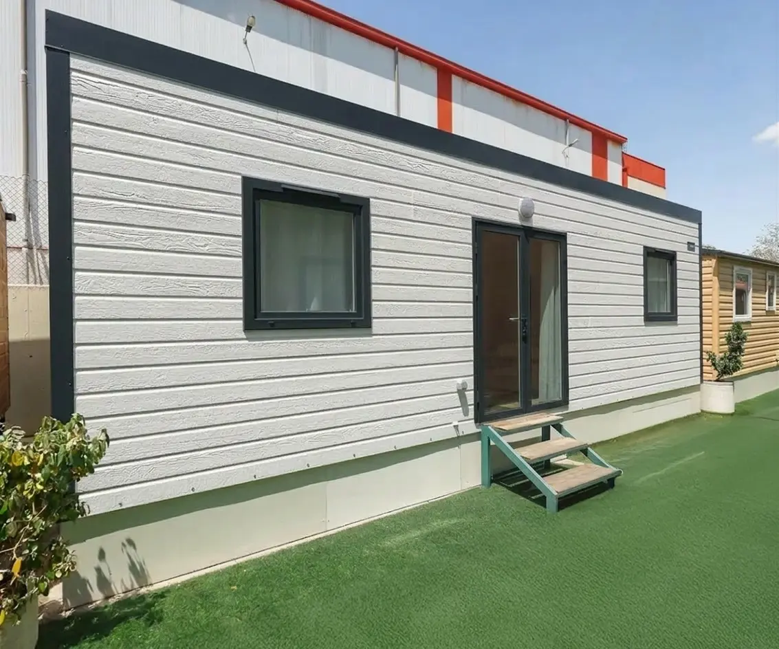 Mobil home nueva en exposición NIDIFY con acabado exterior canexel blanco y carpintería exterior de PVC antracita. Tejado a un agua. Acabado interior colección bambou.