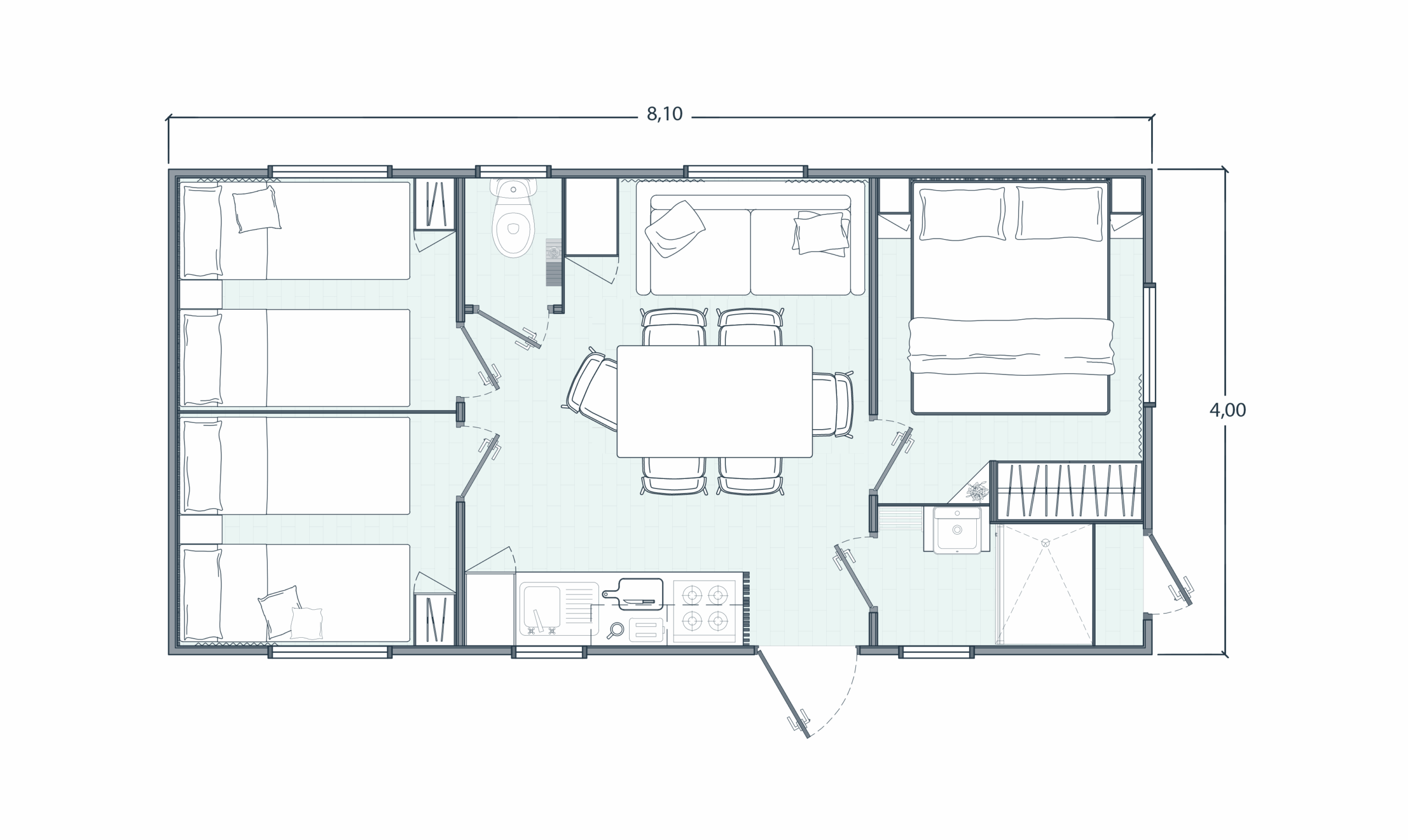 Mobil home nueva en exposición, Nidify Serie E Vanoise 810. Acabado exterior Canexel Classic Nest y carpintería exterior de PVC blanca. Acabado interior serie nature.